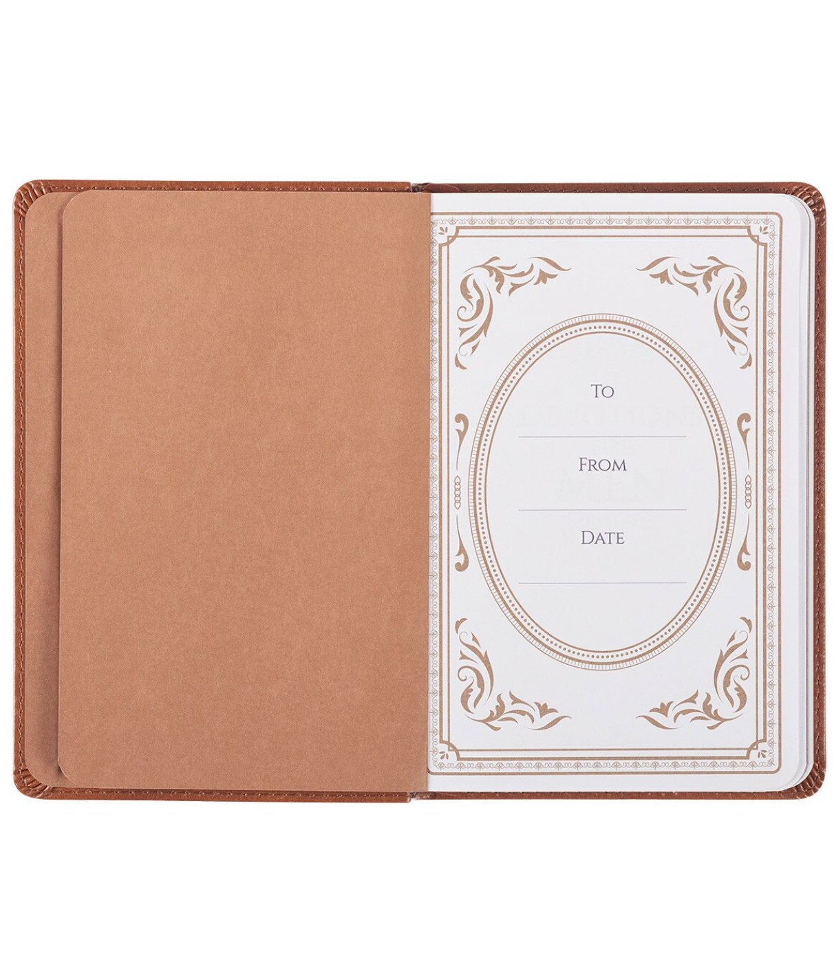The 101 Devotions for Men Tawny Brown Faux Leather Devotional features 101 powerful devotions and supporting Scripture verses to inspire men to rely on God's strength and stand firm on the truth of His Word.