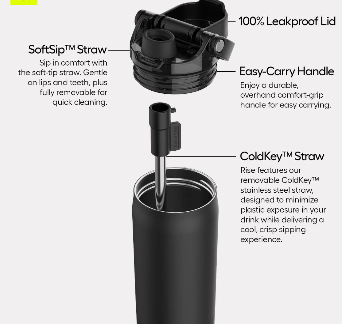 Rise is your new go-to for everyday hydration. The leakproof MagFlip™ lid locks in every sip, BevGuard™ insulation keeps drinks cold, and the covered straw protects your bottle on the go. Sip with the ColdKey™ metal straw so plastic isn’t sitting in your water all day, or remove it to chug from the covered SoftSip™straw - your choice. Plus, Rise 25oz is cup holder friendly, so it’ll fit perfectly in most car cup holders. Finished with a swappable silicone sleeve to prevent dents and dings, Rise simplifies hydration.