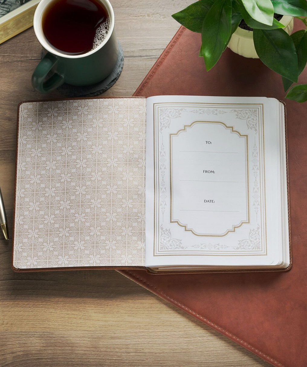 Along with this design, gilt-edged pages make the book something both men and women will enjoy. A ribbon marker matches the dark heat-debossing and makes it easy for you to keep your place as you make your way through the book.