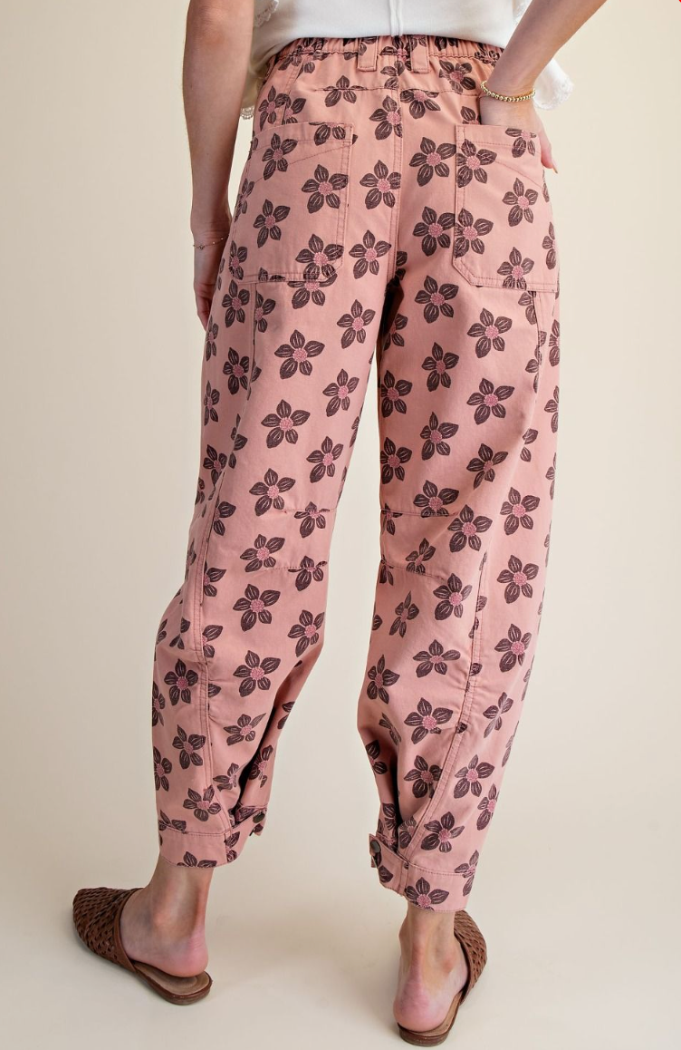 Description: FLORAL PRINT WASHED TWILL BARREL PANTS