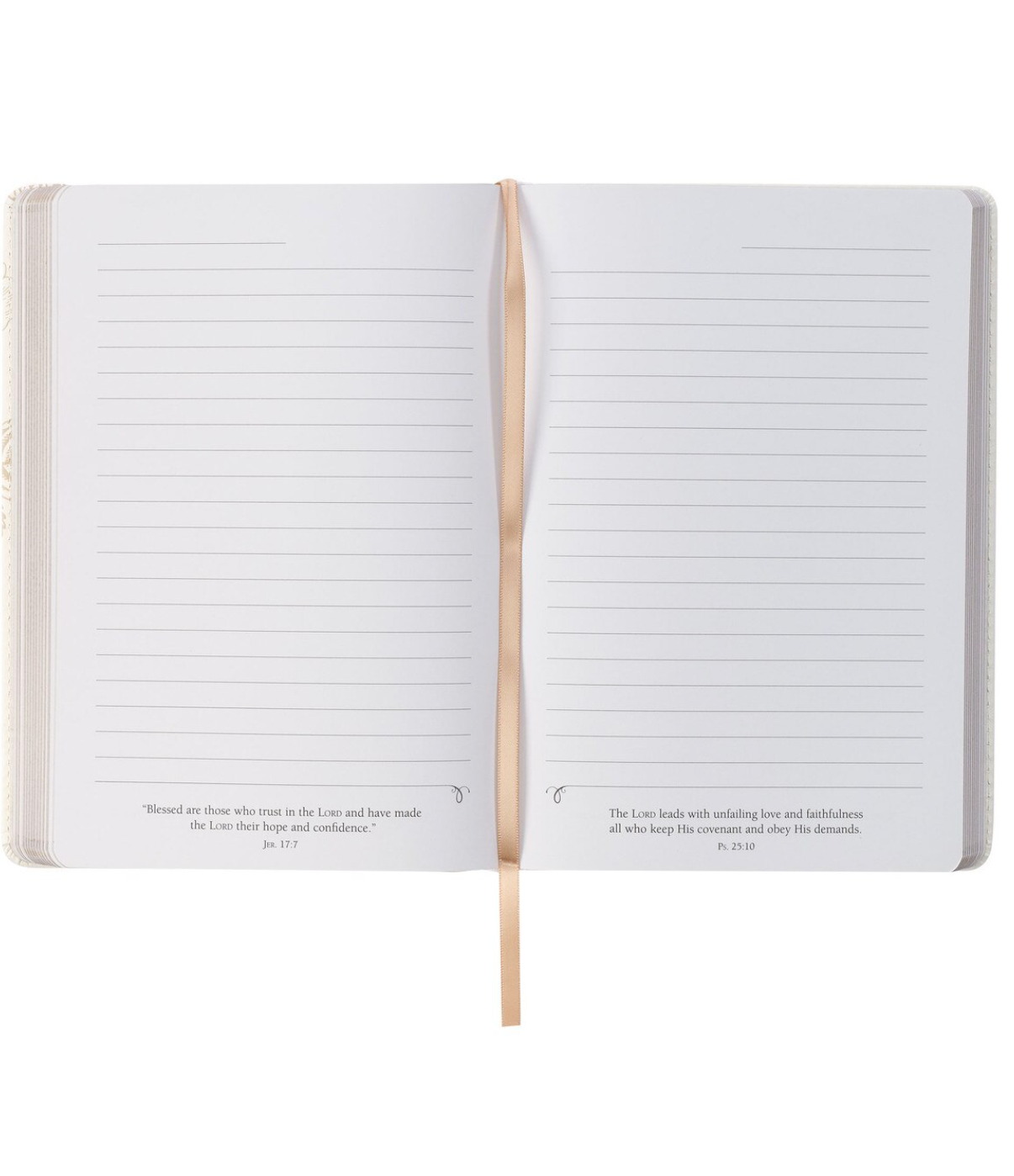 The back cover features a single, screen-printed taupe flower, adding a subtle touch of elegance. White topstitching reinforces the journal's rounded corners and ensures a high-quality product. All 336 lined pages feature Scripture at the bottom that can be used for meditation, prayer, or as a prompt for journaling. A white satin ribbon marker is included to keep your place, ensuring no thought is lost, and every page is quickly found.