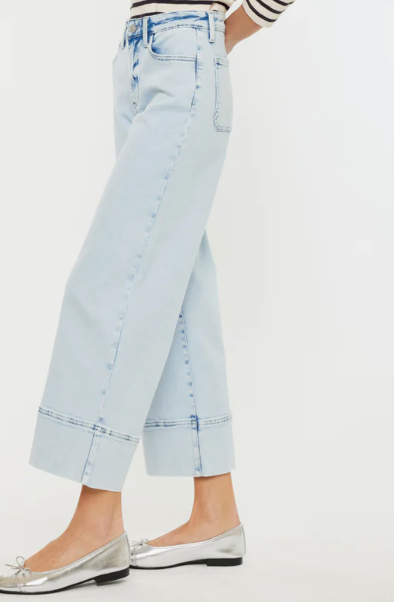 A new stylish style has arrived, in a gorgeous light wash that radiates a sleek relaxed look. This non distressed style hugs you at the waist and flares into a wide cropped leg. With a trouser hem that plays into the sleek relaxed look. With a single button closure, a zipper fly and back dart details.