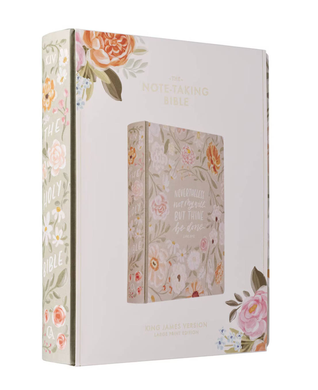 The covers of the KJV note-taking Bible are wrapped in linen decorated with soft pastel floral motifs in a harmonious blend of sage greens, soft pinks, rich creams, and bright oranges. The sentiment is printed in white letters in a handwritten font.