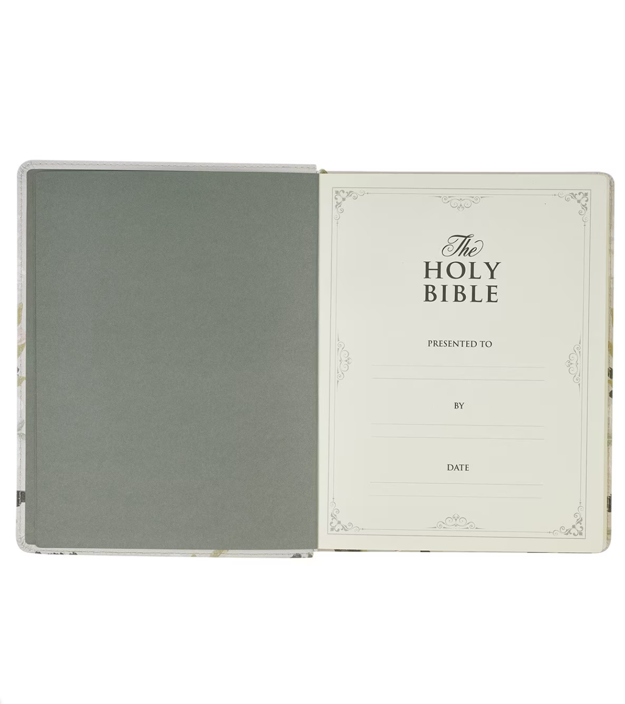 A Spring garden with soft pink budding roses, fuzzy catkins, and fresh sage greens grows on the cream-colored faux leather cover. At the heart of the design is a radiant gold-foiled Scripture verse.