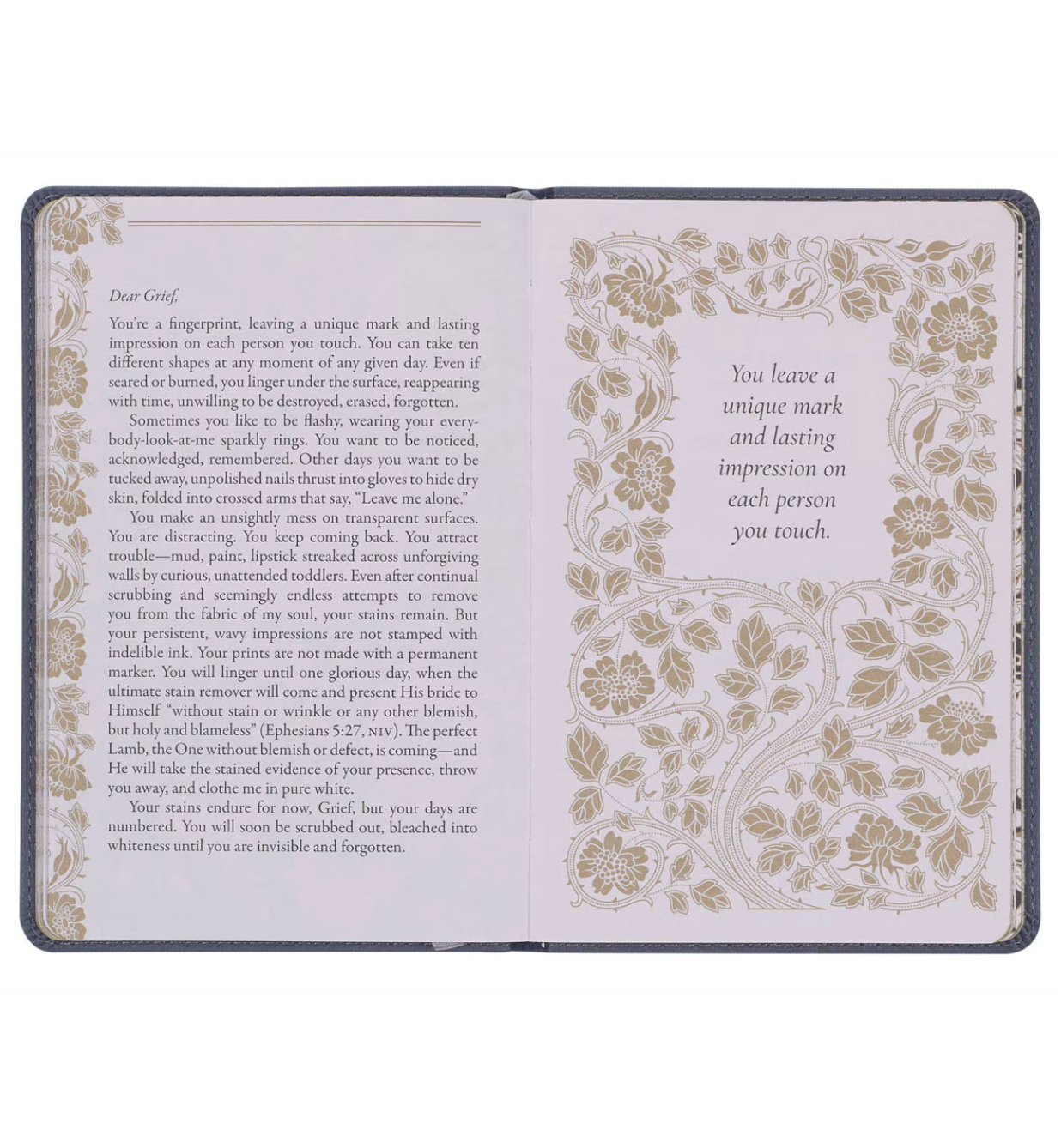 The Letters to Grief Slate Gray Faux Leather Gift Book will help you process emotions and understand the grief process from a Christian perspective. The Letters to Grief Slate Gray Faux Leather Gift Book makes an encouraging gift when words are not enough.