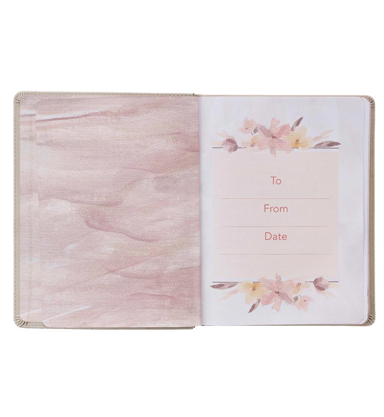 The pages are printed in full color and decorated with soft watercolor florals. A coordinating cappuccino-colored ribbon marker is included to hold your place. A special page is included to customize this devotional for women as a thoughtful present.