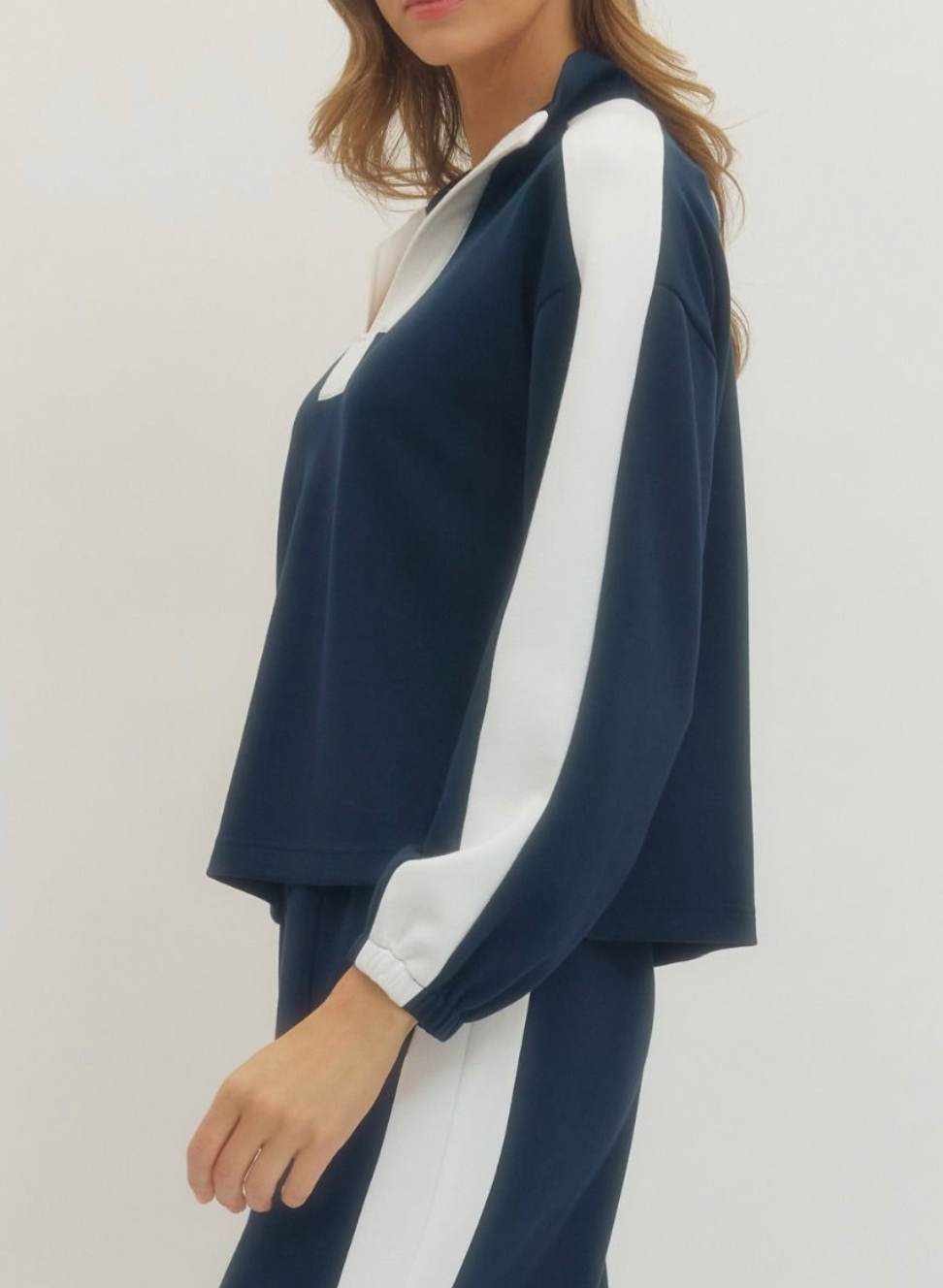 Solid long sleeve knit top featuring contrast collar and contrast stripe detail at sleeves. Side slits at hem. Elasticated sleeve openings.