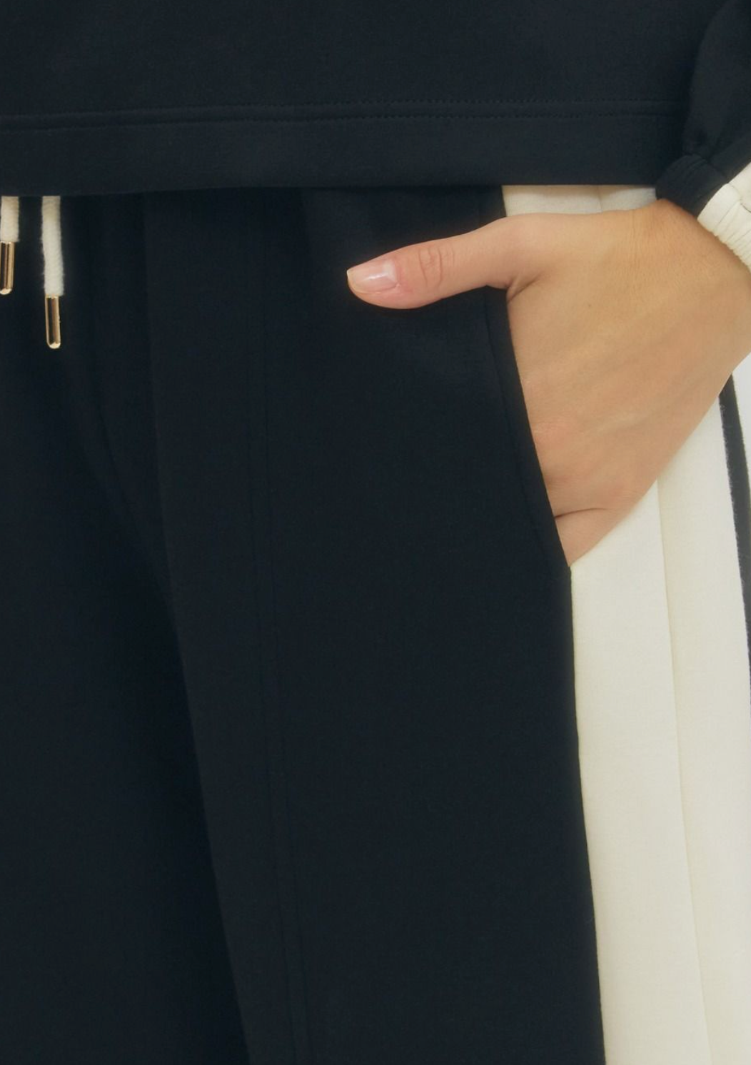Solid wide leg knit pants featuring elastic waistband with drawstring. Contrast stripe detail at sides with slit hem. Side pockets.