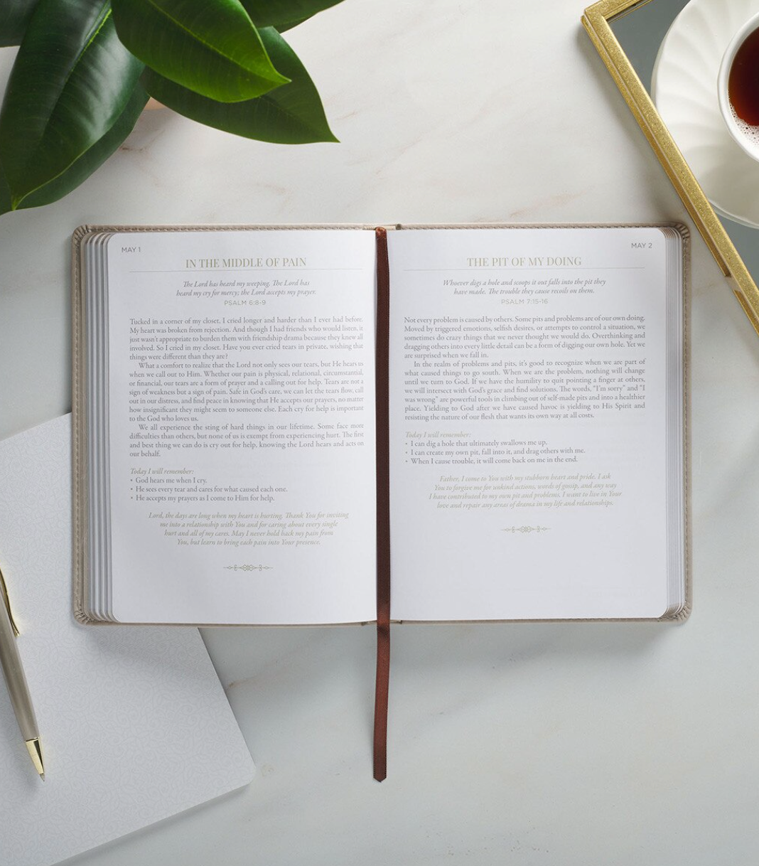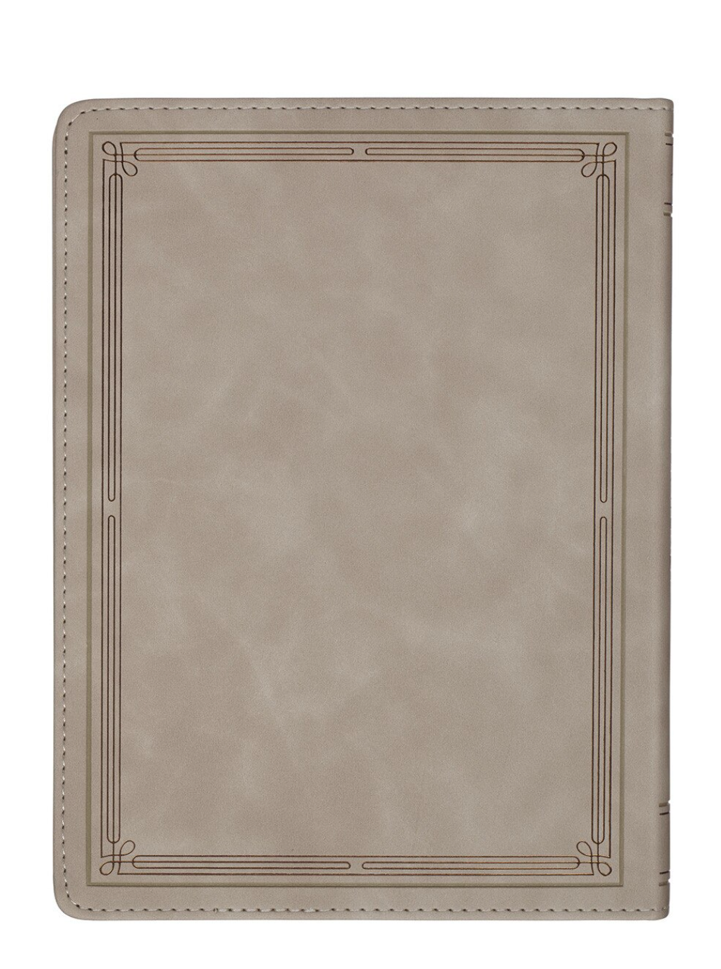 The devotional's rich taupe faux leather cover has a distinctive minimalistic feel with its elegant and simple design. A heat-debossed frame with a greige shadow frame that sports corner scroll designs is the main decoration on the cover. In the middle of the frame, the title and author's name are printed in greige and are underscored by an understated heat-debossed filigree design.