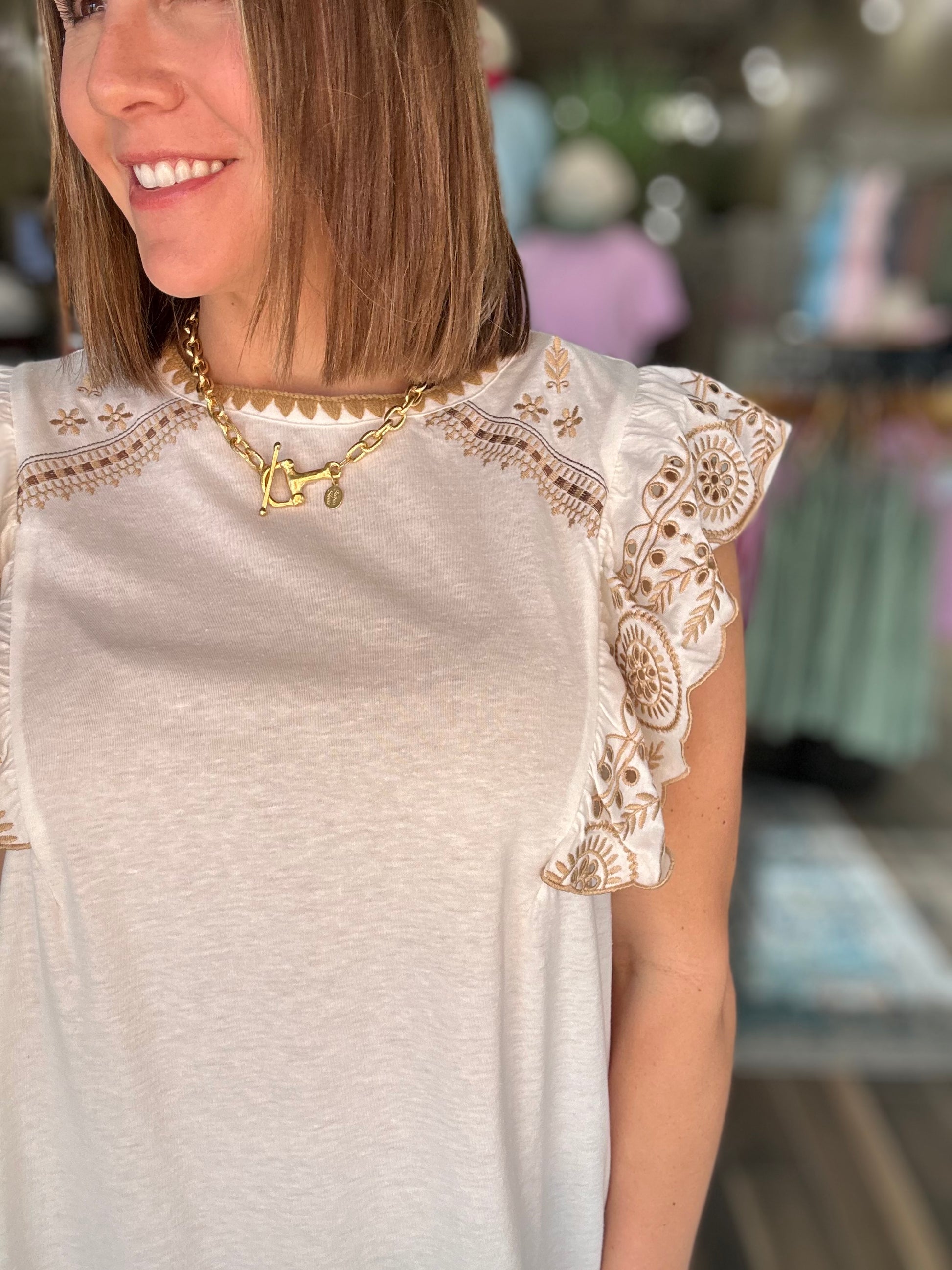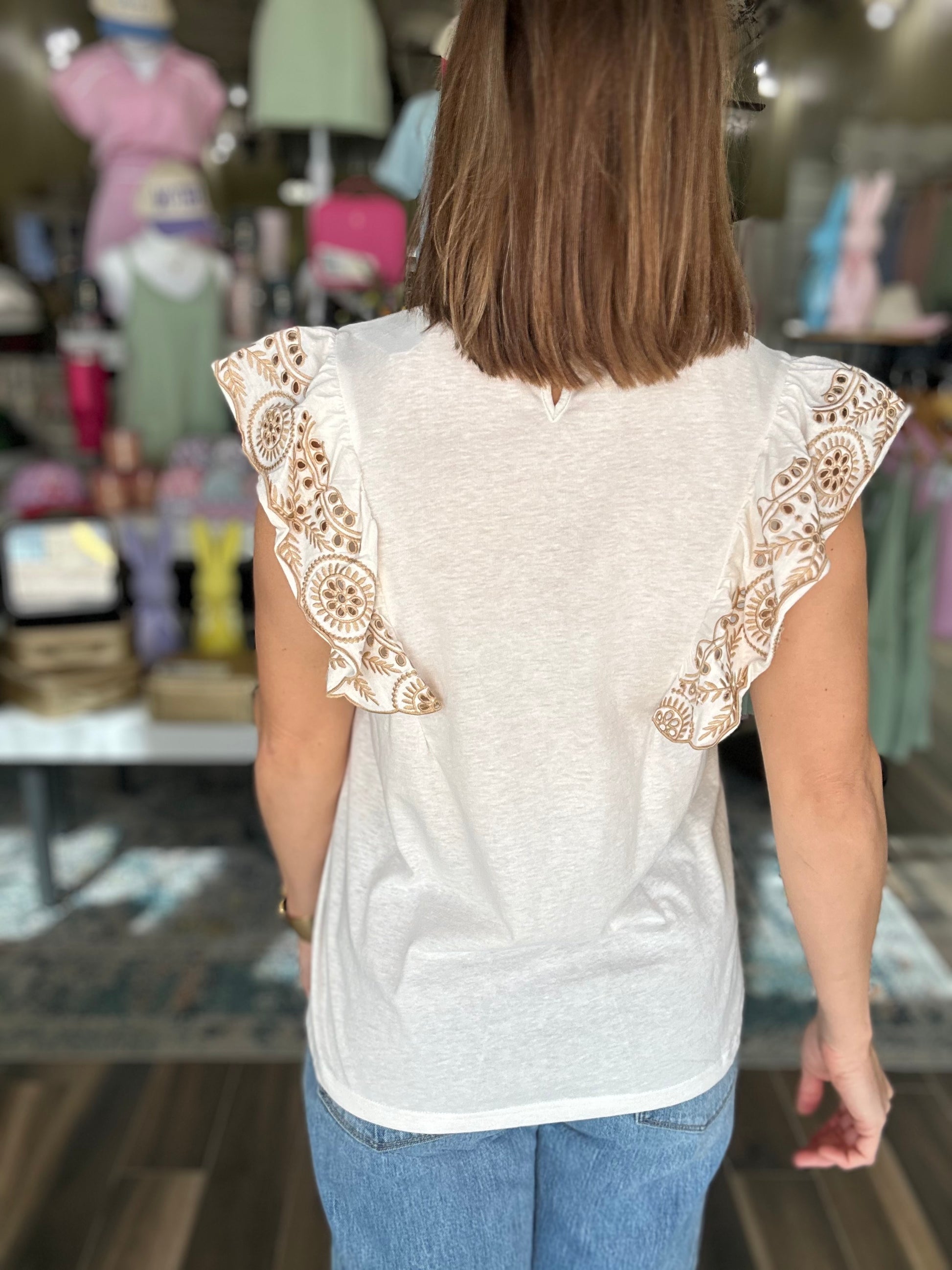 Description: CAP SLEEVES EMBO DETAILING TOP