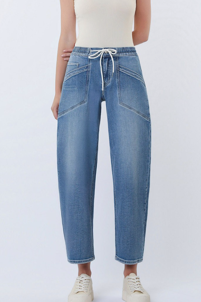 HIGH RISE ELASTIC WAISTBAND WIDE BARREL JEANS