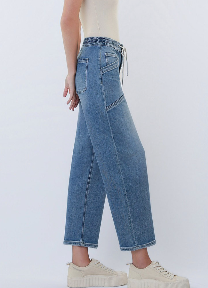 COMFORT STRETCH DENIM, HIGH RISE WAIST, ELASTIC WAISTBAND, CROPPED LENGTH, MEDIUM WASH, WIDE BARREL JEANS